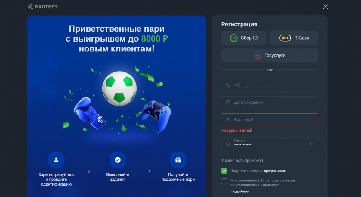 Этап 1 — бездепозитный старт. Регистрируетесь на сайте baltbet.ru, выбираете опцию «Приветственные пари», проходите идентификацию через ЦУПИС. Верификация занимает от нескольких минут до пары часов в зависимости от выбранного способа. После подтверждения личности на счёт поступает первый фрибет — ординар с коэффициентом 1.40–3.00 и потолком выигрыша 300 рублей.