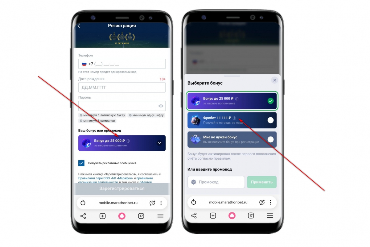 У Марафон есть альтернативный приветственный бонус — 100% на депозит до 25 000 ₽. Сравним: