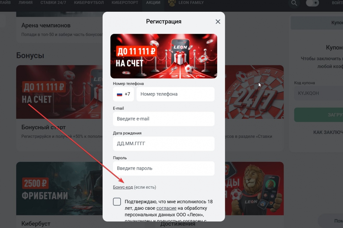 Как ввести промокод Leon и получить фрибет